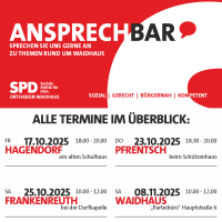 „Wir sind ansprechbar und bleiben das auch weiterhin für alle Waidhauser Bürgerinnen und Bürger.“ Deshalb kommen wir mit dem urigen Ape-Mobil, welches zur „Ansprech BAR“ dekoriert wird, zu Euch in die Ortsteile und nach Waidhaus. Wir laden euch zu kostenlosen Getränken wie süffigem Bier, Sekt oder auch alkoholfreien Getränken ein. Je nach aktueller Temperatur werden wir auch Glühwein und Kinderpunsch anbieten. Unsere Kandidatinnen und Kandidaten sind für euch „ansprechbar“, hören sich eure Anliegen an und beantworten eure Fragen soweit möglich.